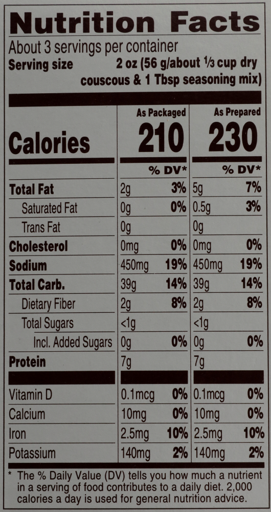 Visit calorieking to see calorie count and nutrient data for all portion sizes. ** percent daily values are based on a 2,000 calorie diet. When prepared as directed, a serving of couscous and seasoning plus olive oil provides 4.5g total fat (0.5g saturated fat, 0g trans fat), 0mg cholesterol, 510mg sodium, 40g total carbohydrate (2g dietary fiber, 0g sugars) and 8g protein. When prepared as directed, a serving of couscous and seasoning mix plus olive oil provides 5g total fat (0.5g saturated fat, 0g trans fat), 0mg cholesterol, 450mg sodium, 39g total carbohydrate (3g dietary fiber, 0g sugars) and 8g protein. Cook for 5 to 8 minutes or until well browned. 4% fat, 80% carbs, 16% protein. $1.32 ($0.23/oz) $1.32 ($0.23/oz) $1.32 each ($0.23/oz) product description. Durum wheat semolina, pine nuts, salt, autolyzed yeast. H‑e‑b toasted pine nut couscous. 3/4 cup parmesan cheese, grated For a serving size of (g) how many calories are in couscous mix, toasted pine nut? Get near east toasted pine nut couscous mix (5.6 oz) delivered to you within two hours via instacart. Amount of calories in couscous mix, toasted pine nut: